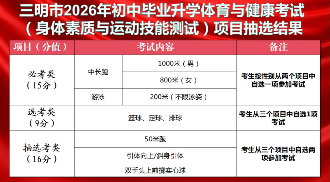 根据省教育厅最新文件精神,从2026年起,体育中考笔试取消,分值调整至篮球、排球、足球“三大球”;“三大球”抽考改为选考,考生从三个项目中自选1项考试。