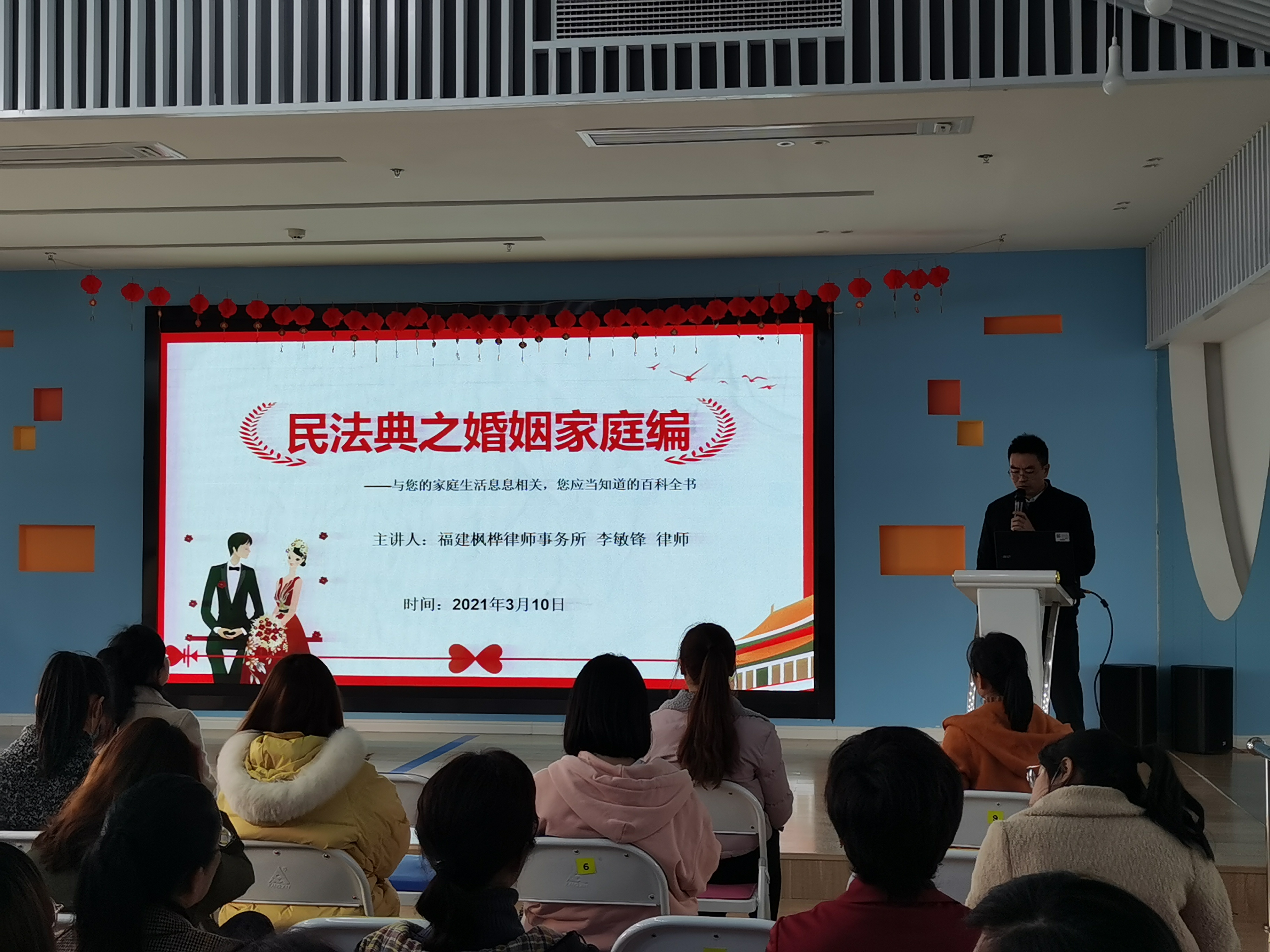 为提高幼儿园女职工的法律意识,保障自身合法权益,日前,梅列区贵溪洋第二分园开展《民法典》婚姻家庭篇专题法律知识讲座,70余名女职工参与。
