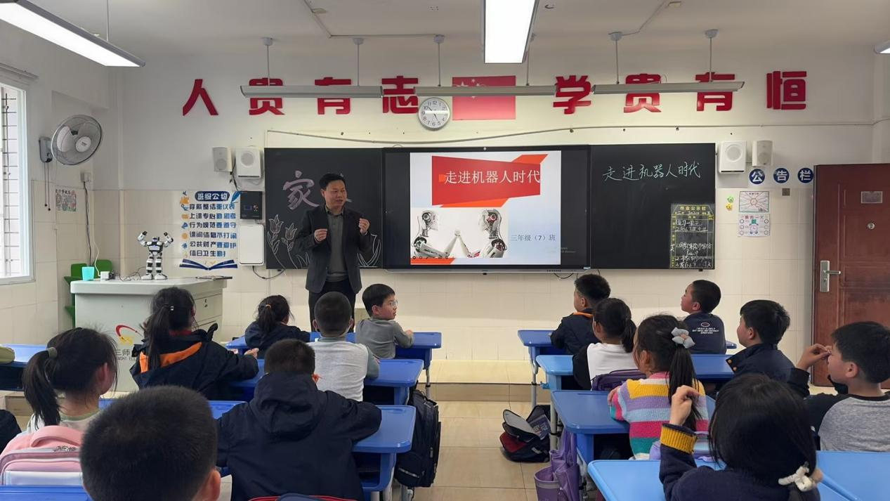 当邱于洛爸爸拿出带来的小型机器人,现场演示编程指令操控机器人走路、转头、亮灯、发出声音时,教室里瞬间掀起了高潮。孩子们紧紧盯着灵活移动的机器人,嘴里不时发出“哇!太厉害了!”的惊叹声。看到机器人跟着指令做出一系列动作,孩子们欢呼雀跃,有的拍手叫好,有的激动地跳起来,还有的不停举手追问,想知道如何才能让机器人听从指挥,探索的热情被彻底点燃。而当观看到解魔方机器人0.38秒创下吉尼斯世界纪录、灵动的蚂蚁机器人等趣味画面展播时,孩子们更是满是好奇,讨论声此起彼伏。