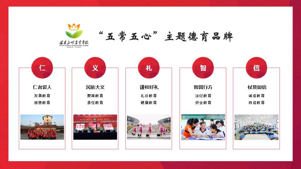学校通过开展社会主义核心价值观与中华优秀传统文化教育融合研究,凝练出“常存爱国之情,常怀感恩之心,常伴礼仪之行,常辩是非之事,常践诚信之诺”为内涵的“五常五心”主题德育品牌。围绕培育“五常五心”,创设德育文化走廊3处,修订制度规范12份,编写教案学案2册,形成活动案例15篇。同时,将德育活动“菜单化”、“校历化”,每学期开展主题教育实践活动190余场次,每周定期开展班团活动、社团活动等,逐步实现“贴近实际、贴近生活、贴近学生”,“以小为大、以小见大、以小带大”,“亲历实践、亲身感悟、亲情表达”的主题教育特色品牌。