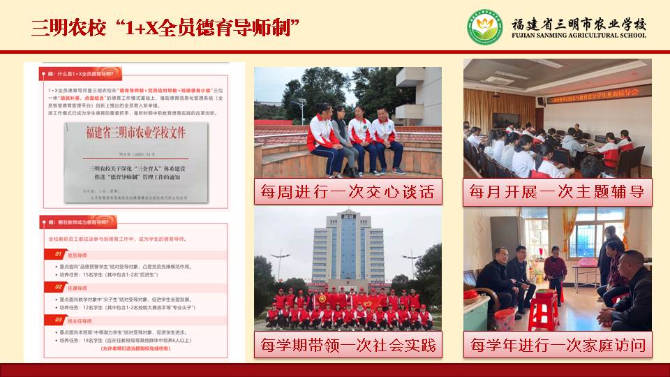 学校在“德育导师制+党员结对帮教+班级德育小组”三位一体“培优补差、点面结合”的德育工作模式基础上,提出了全校教职工每人担任若干名学生德育导师的“1+X全员德育导师制”创新举措。打造面向不同学生群体的“三支导师队伍”(党员德育导师、技能德育导师、班主任德育导师)、确立导师“六项工作职责”(思想上引导、专业上指导、心理上疏导、学业上辅导、生活上倡导、品行上督导)和定期开展的“四项辅导活动”(每周一次关心谈话、每季度一次主题辅导、每学期一次社会实践、每学年一次家庭访问)的工作模式。师生通过德育平台双向选择结对,通过定期辅导获取综合素质积分,实现“学生主动、教师主导、人人参与”的德育局面。