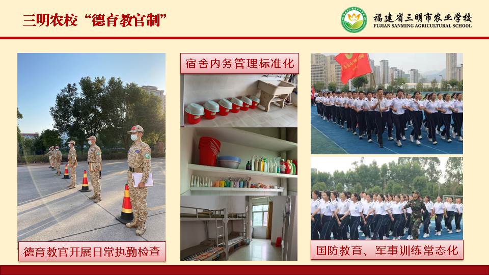 学校以学生行为习惯养成为突破点,尝试探索适合中职学校的“军事化管理”模式,提出“德育教官制”的新举措。通过引进专业化国防教育机构,成立“德育教官制管理委员会”进行综合协调调度,聘请18名高素质退伍军人驻校加强德育管理力量,将校园周边、教学区、生活区、运动区等无死角纳入管理范围,已推进“准军事化寝室管理工程”、“校园安全综合指挥工程”、“德育预警生素质拓展工程”、“学生两操体质健康工程”等精细化管理项目。学生文明礼仪、生活习惯、精神面貌等发生了较大改变,学校管理不断规范精细,学校获评教育部“国防教育特色学校”。