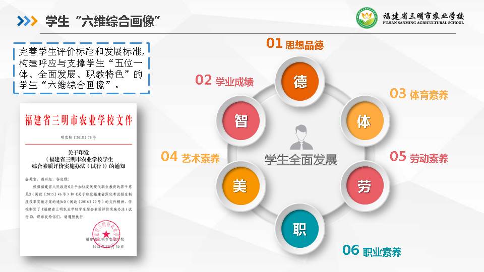 学校坚持“五育并举,德育为先”为原则,在开展“中职学生综合素质评价体系”课题研究的基础上,改革学生评价,确立了涵盖德智体美劳和职业素养的“六维综合画像”评价标准,制定了《三明农校学生综合综合素质评价实施办法》,设置学生综合素质成长评分点和量化细则。评价过程注重以“修德”带动“智体美劳和职业素养”的全面发展。实行“思想品德”得分“提示预警”和“一票否决”。同时,评价要素注重学生“六大方面”成长过程的写实记录,最终形成一份反映学生“画像”的综合素质评价报告。