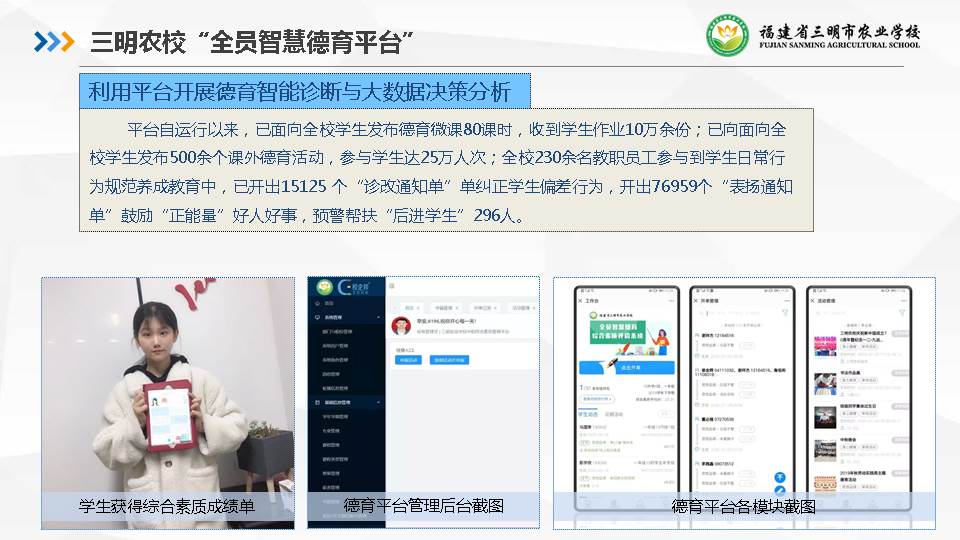 学校在制定“学生综合素质评价标准”基础上,开发了“全员智慧德育综合素质评价管理系统”,实现对学生日常成长发展状况的记录、评价、查询、预警等功能。教师日常开展德育管理,通过微信手机端一键登录,随时随地参与学生日常成长考评,实现对学生思想品德全过程、多维度、全方位、数据化的评价,评价结果可视、可追溯。平台自运行以来,已面向全校学生发布德育微课80课时,收到学生作业10万余份;已向面向全校学生发布500余个课外德育活动,参与学生达25万人次;全校230余名教职员工参与到学生日常行为规范养成教育中,已开出15125 个“诊改通知单”单纠正学生偏差行为,开出76959个“表扬通知单”鼓励“正能量”好人好事,预警帮扶“后进学生”296人。