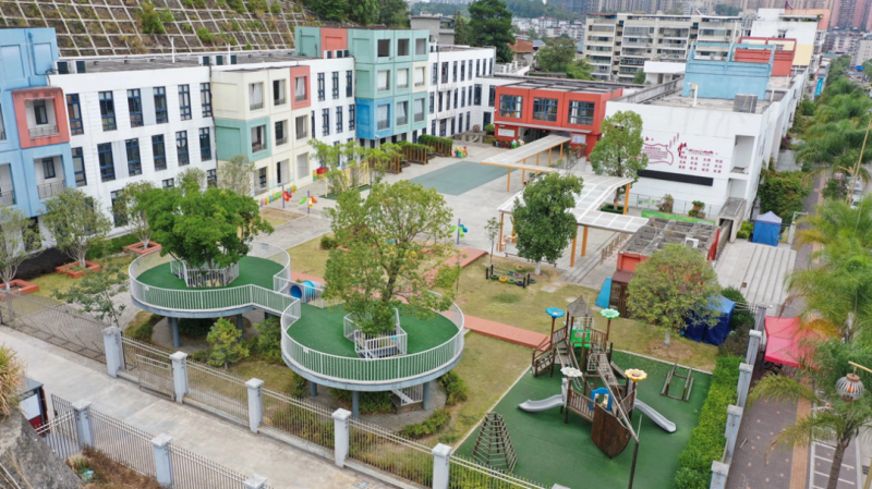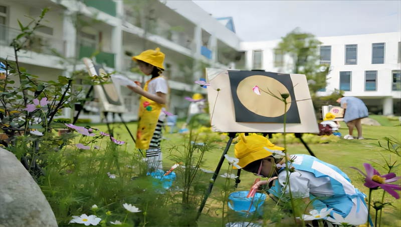 一是户外探索常态化,激活自然感知。固定每周二、周四开展户外实践,以周边山水为课堂,引导幼儿运用树枝、花朵等自然物观察、记录、创作,衍生出《搭建庇护所》《闻香识物》等趣味课程,让学习与自然紧密联结。二是“魔方时间”创特色,释放童年活力。划分十二个户外游戏区域,开展晨间混龄互动。从《趣玩肾蕨》的科学探索,到《树屋餐厅》的生活模拟,幼儿在自然运动、艺术创作中锻炼能力,体验人与自然和谐共生的乐趣。