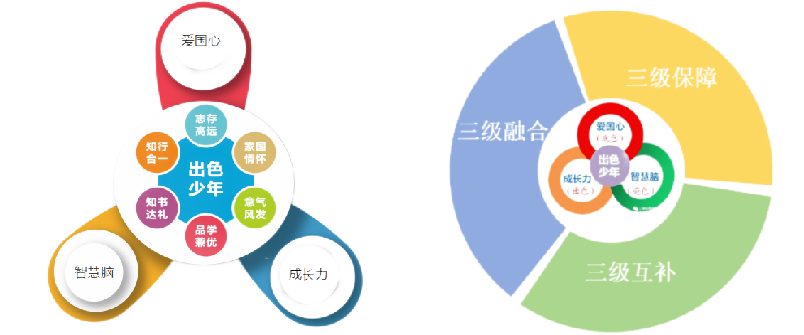 为实现培养出色少年的目标即“爱国心”“智慧脑”和“成长力”,学校构建了三级“保障”机制、三级“互补”机制、三级融合模式,旨在助力对应德育与社会主义核心价值观的传承、科学认知能力和高阶思维的培养,以及学生综合素质的出色目标实现,促进家校共育,尊重儿童个性,共同解决教育问题,从而实现学生的全面发展,培养出新时代的好少年。