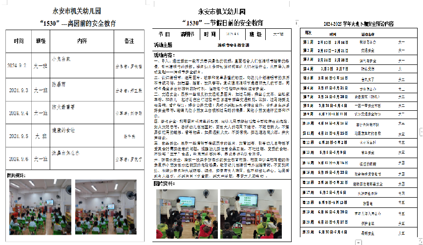 落实“每日1分钟”放学前的安全小主播提醒。充分利用离园前的碎片化时间,设立班级“安全播报站”。鼓励幼儿化身“安全小主播”,分享安全知识与家庭安全小故事,在锻炼语言表达能力的同时强化自身安全认知。同时,结合儿歌、动画、情景模拟等形式,针对当日活动场景进行即时安全提示,让安全意识融入幼儿日常点滴。开展“每周5分钟”主题安全教育。依据季节变换、节日特色,每周开展交通安全、防溺水、防火等主题安全教育。通过互动游戏、角色扮演、绘本共读等寓教于乐的方式,帮助幼儿掌握安全知识与防护技能。如春季开展“防过敏性疾病”科普,夏季组织“防溺水儿歌创编”活动,让安全知识入脑入心。强化“每节假日30分钟”综合安全课。在节假日来临前,通过情景演练、案例分析、亲子任务等形式,系统讲解居家、出行、饮食等安全注意事项。同步发放《假期致家长一封信》,形成“园所教育-幼儿学习-家庭监督”的闭环式安全教育体系,确保幼儿假期安全。