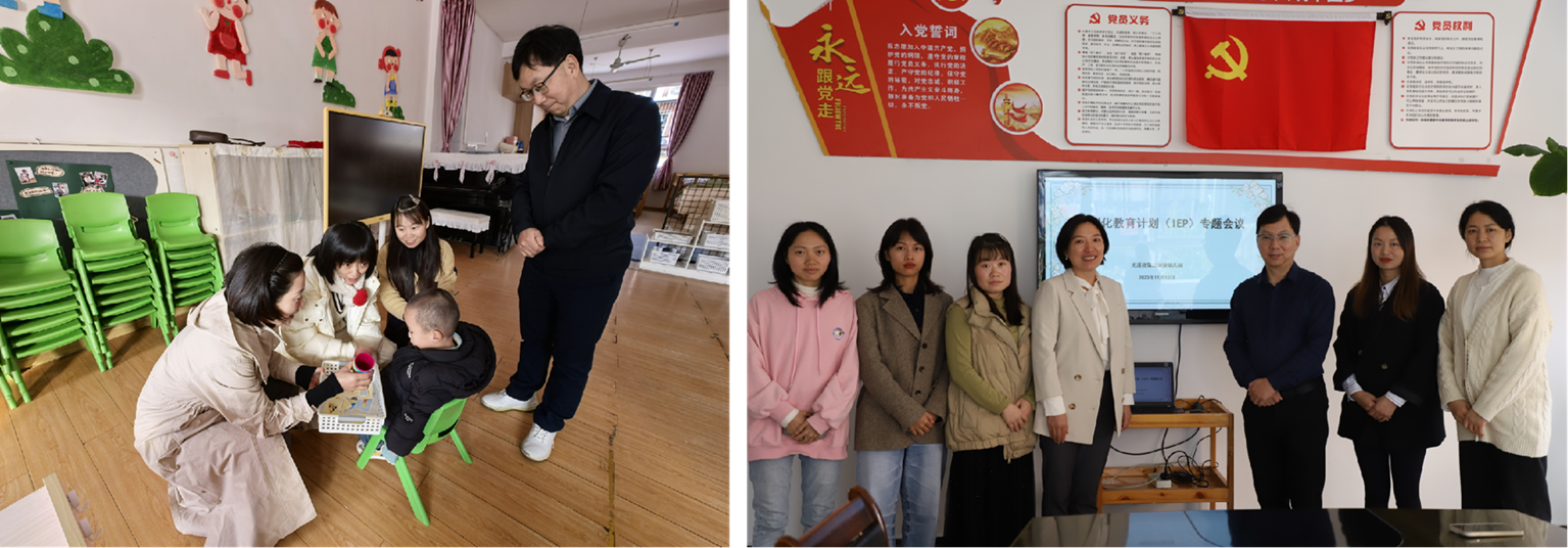 融合教育需要构建一个同心同德的“同伴”支持系统。一是医教协同,实现早期发现的“专业同伴”。建立“新生入学医教宣传”机制,邀请专家开展专题讲座不少于20场。联合县妇幼保健院进行入园体检与心理行为筛查,对疑似心理异常儿童,组织家长见面会,解读评估结果,宣讲干预策略,引导家长遵循“早发现、早诊断、早干预”原则对特殊进行干预治疗。三年来,推动医学复评与康复干预率达100%,为特殊需要儿童赢得了宝贵的康复黄金期。二是实施IEP课程,践行个别化教育的“规划同伴”。建立“医生测评—特教观察—综合评估—IEP会议”的标准化流程,汇聚医生、特师、家长、普师多方智慧,为特殊儿童量身定制个别化教育计划(IEP)。全面推行“一人一作息表、一人一课表”的个性化教学模式,确保教育干预的针对性与有效性,累计制定并实施4份IEP计划。三是教研共生,打造教师成长的“学术同伴”。组建“专家引领、骨干牵头、园本教研、家园共研”的四级融合教研团队。通过微型家长会、专题研讨、线上交流等形式,年均开展教研活动30余次,深化“双师协作”(特师与普师),确保课程实施与个体发展评估的精准对接,实现了教师团队在融合教育实践中的专业共生。