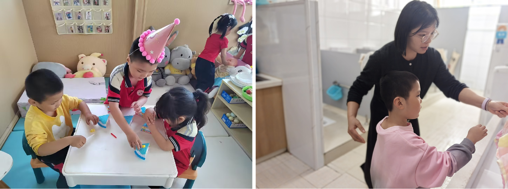 幼儿园遵循“一日活动皆课程”的理念,将融合教育自然渗透于园内每一个环节。一是路径渐进:从“单一”到“全日”的同伴活动时间。采取“三段式”渐进融合策略:初期以“生活活动”为主,建立安全感;中期逐步增加户外运动与小组活动、区域活动等,参与小组同伴互动;后期融入集教教学和游戏活动,参与大集体同伴活动,引导特殊儿童逐步适应幼儿园一日活动,参与率达到100%。二是目标分层:从“短期”到“长期”的同伴成长任务。根据评估结果,为特殊需要儿童预设短期(行为缓解)、中期(行为干预)、长期(能力补足)的分层目标。例如,通过艺术活动疏导情绪,利用平衡类游戏改善感统失调,使每个阶段的目标都成为孩子“跳一跳能够到”的“任务同伴”,激发其内在成长动力。三是支持动态:从“1”到“N”的同伴角色调整。根据其需求创新“1+N”同伴支持模式。家长作为“1”长期同伴,随着融合深入,逐渐调整增加保育员、主班教师、幼儿等“N”个不同角色的同伴,这种动态调整伙伴,增强了特殊儿童对多样化人际关系的适应能力。