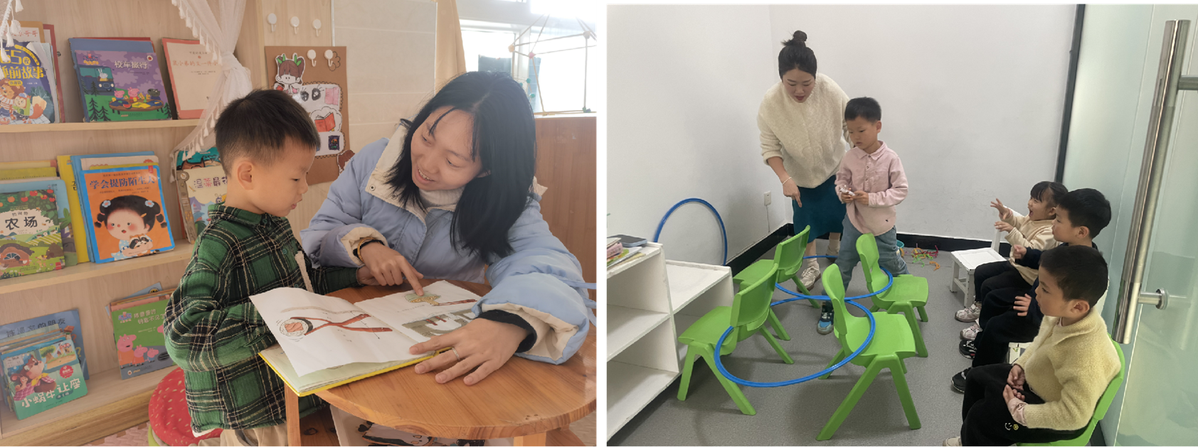 在个性化干预中注重创设“同伴情境”,让能力在真实的互动中得以泛化和提升。一是精准个训:与教师结成“学习同伴”。依托专用个训室,教师根据IEP目标与儿童现状,调整学习内容,提供补充性操作材料,在一对一的密集互动中,重点提升其认知、社交、语言等核心能力。个别化训练每周覆盖全体特殊儿童,关键技能达成率稳步提升。二是内外衔接:让康复成为“接力同伴”。针对需干预的儿童,借助专业康复机构进行强化训练,待基础能力达标后,再逐步增加园内融合活动时长与强度,形成校内外专业力量无缝接力的“同伴”关系。三是社交小组:在小组遇见“合作同伴”。每周三由县妇幼保健院康复教师到园开展小组教学,为特殊儿童创造安全、结构化的微型“同伴社会”,提升等待、合作等社交技能,社交训练比例达90%以上。