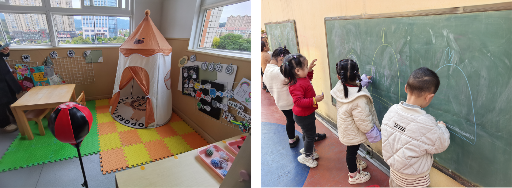 幼儿园通过建设物质环境与营造和谐氛围为特殊儿童个性成长需求支持力的“隐性同伴”。一是环境支持:管理情绪与行为的“静态同伴”。针对幼儿的刻板行为与情绪需求,创设“情绪小屋”等安静区,提供安抚玩具。在户外针对性投放荡桥、爬梯、蹦床等感统器械,让环境本身成为帮助儿童平稳情绪、满足感官需求的“好同伴”。二是材料驱动:激发优势与自信的“兴趣同伴”。尊重并利用特殊需要儿童的刻板兴趣与能力特长,在活动区设置“爱心材料盒”,内置其偏好的个性化操作材料。鼓励他们通过优势领域参与活动,让材料成为他们展示自我、体验成功的“兴趣同伴”,从而激发参与活动的内在动机。三是氛围营造:拓展社交与技能的“流动同伴”。全园教职工对于特殊儿童予以平等对待,鼓励语言发育迟缓儿童开口问好,互动表达;安排星宝与同伴参加文明值守;创设融合区支持特殊儿童增强认知;引导普通儿童协助星宝合作游戏等。每周定期开展2次混班游戏活动。通过与不同的“流动同伴”互动,拓展特殊儿童的社交广度与深度。