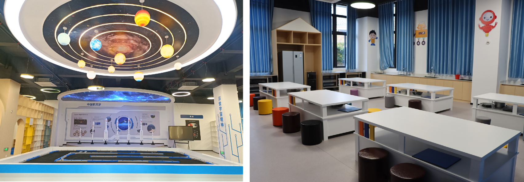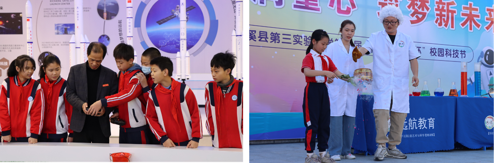 围绕“让校园成为科学探索乐园”目标,打造“三维立体”科学教育空间,实现环境育人与科教融合深度衔接。一是智慧阅读科技馆。整合云谷图书馆、飞天航模区、幻影赛车区、巧手创智屋、科幻绘艺室五大功能区,构建“阅读—体验— 创作”完整育人链条。云谷图书馆重点配备航天、生态、工程等领域科普书籍,每月开展“科学读书会”,年均覆盖学生超1000人次;飞天航模区定期组织航模制作与竞赛训练;巧手创智屋与科幻绘艺室每年联合举办“创意科学手工展”,有效激发学生创新热情。二是科普创客工坊。划分四模智创室、虚拟体验区、模型实操区、科学实验室、无人机操作室五大分区,实现“理论—模拟—实操”闭环教学。其中,四模智创室开设多类模型课程;虚拟体验区借助VR设备开展抽象实验模拟,破解山区学校设备不足难题;科学实验室常态化开设“植物生长对比”等探究性实验,强化学生动手能力。三是全域阅读角。在图书馆、教室图书角、开放式书吧增设 “航天科普专区”,投放《中国航天史》等优质科普书籍。推行“10 分钟课间科学阅读”制度,班级每周开展“科学阅读分享会”,持续拓宽学生科学视野。